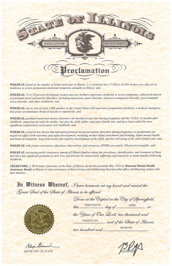 The Postpartum Depression Alliance of Illinois (PPD IL) has worked with Illinois Governors for the past 23 years in order to have May proclaimed Maternal Mental Health Awareness Month in Illinois. We use this month to bring increased public awareness to the prevalence, symptoms and effects perinatal mood disorders can have on women and their families